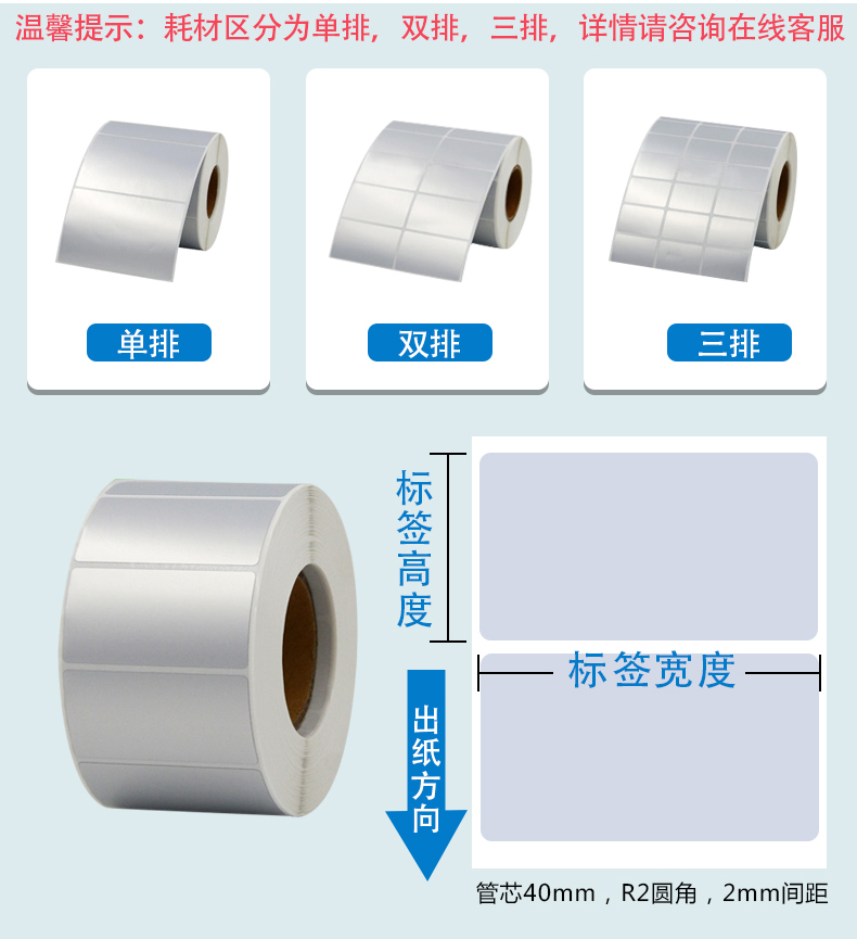 材質(zhì):?jiǎn)°y標(biāo)簽紙 膠水:水膠 規(guī)格:?jiǎn)闻?雙排 三排 四排 打印方式:熱轉(zhuǎn)印打印 搭配碳帶:需要碳帶 實(shí)用機(jī)型:有熱轉(zhuǎn)印打印機(jī)功能的打印機(jī) 應(yīng)用范圍:廣泛應(yīng)用于超市,餐飲,酒店,銀行,電信,醫(yī)療等各個(gè)行業(yè)
