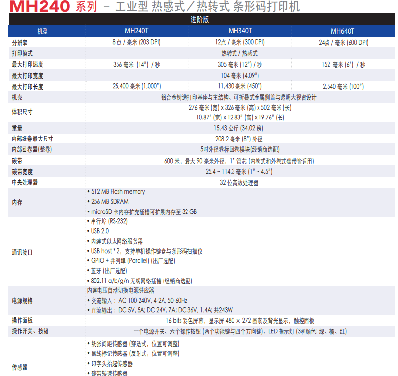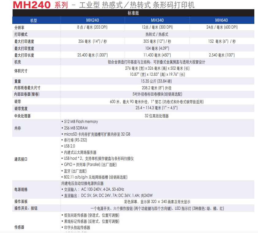 支援小標簽剝離- 最小長度達0.5吋(MH240/MH340/MH640 和MH240T/MH340T/MH640T)